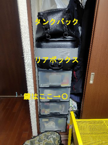 | 俺の部屋に入ってすぐ左の扉の中に、 プラスチックの棚が有ります。 鍵は上から2段目の左側に入れてあります。 リアボックスと、 タンクバックを付けて来てください。 |