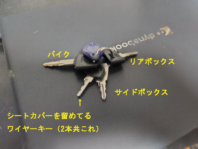 | まずはバイクカバーを外してください | まず前後ホイールについてるワイヤーキーを両方外して、 バイクカバー(3枚重ね)を一枚ずつ外してください。 |